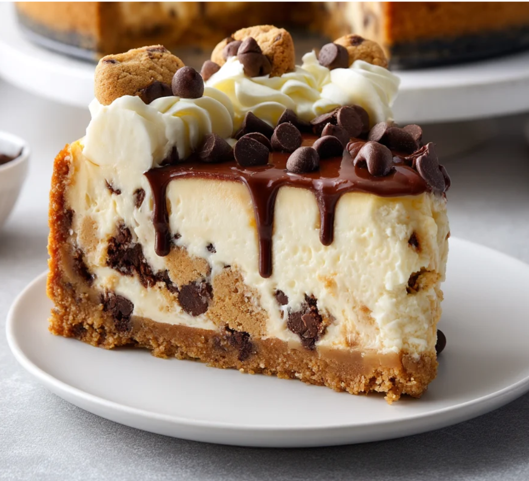A rich cheesecake layered with soft cookie chunks and smooth chocolate drizzle. Creamy, crunchy, and perfectly indulgent in every bite.